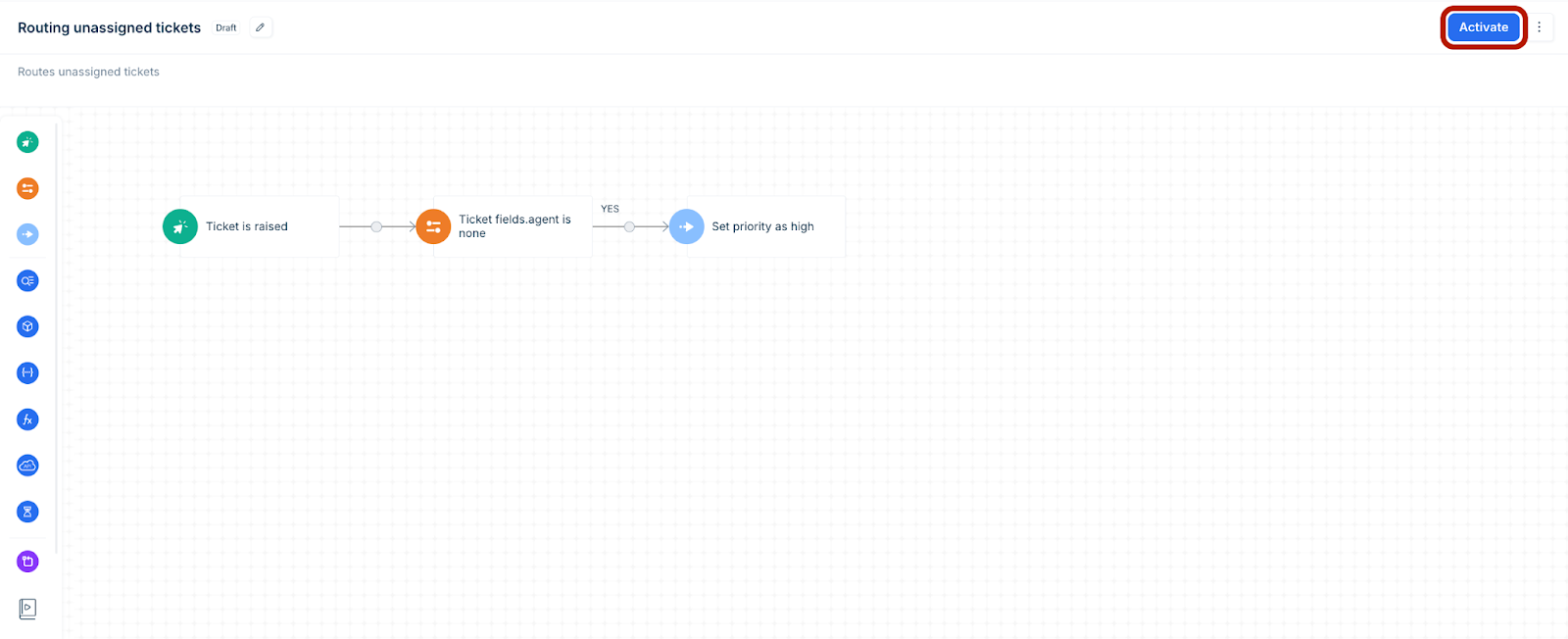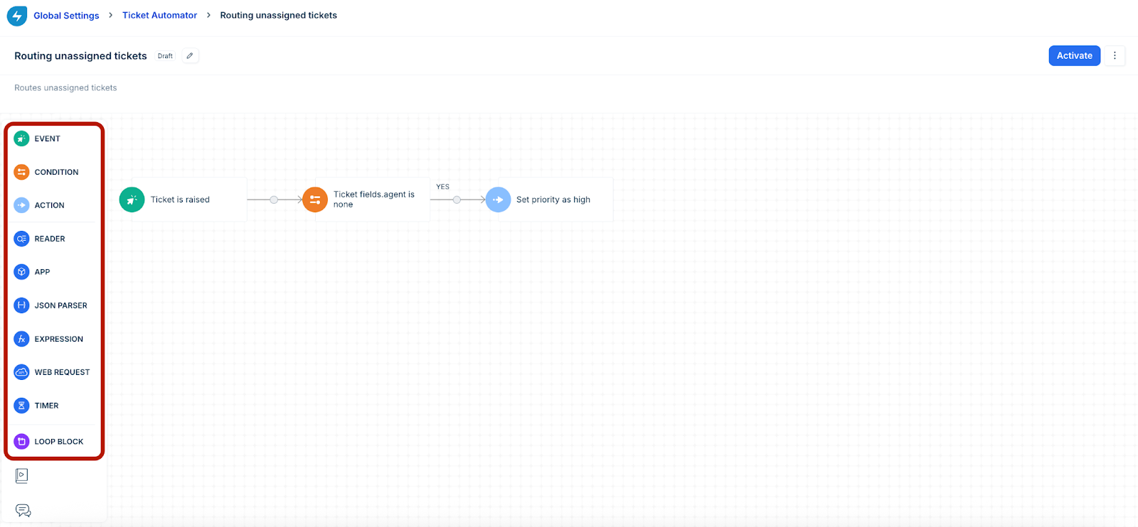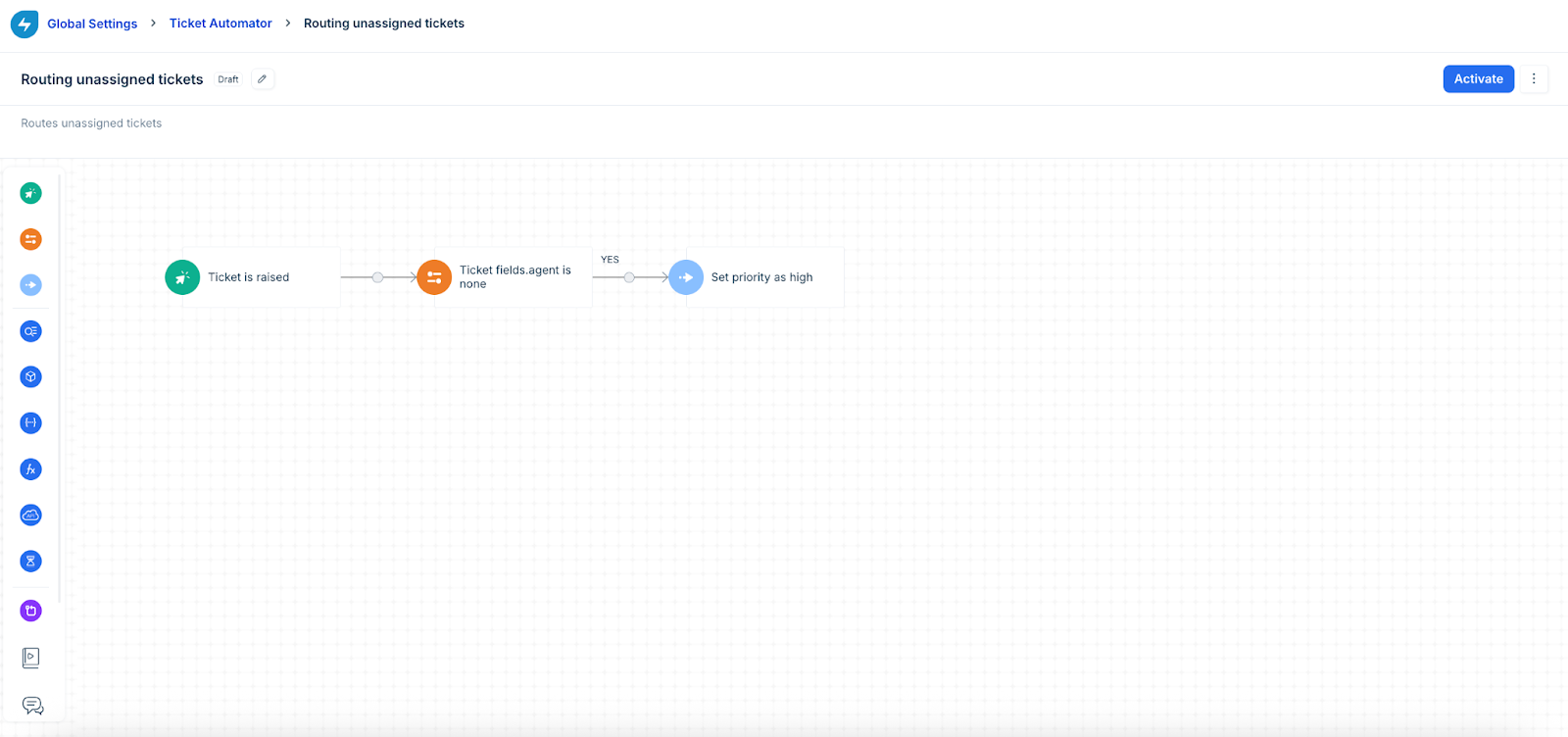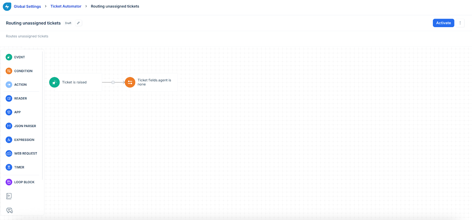 The Freshservice Workflow Automator module helps you configure various workflow automations. All the repetitive tasks and manual processes that are performed on a daily basis (such as assigning tickets to the right agent or team, or following up on approvals) can be automated with workflows using simple and quick drag-and-drop actions.
