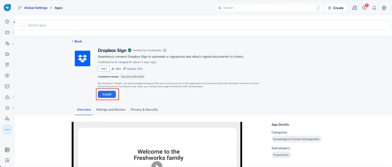 Ongoing signature requests: Requests already sent may continue independently in Dropbox Sign; however, Freshservice no longer receives API updates or status changes from the app.