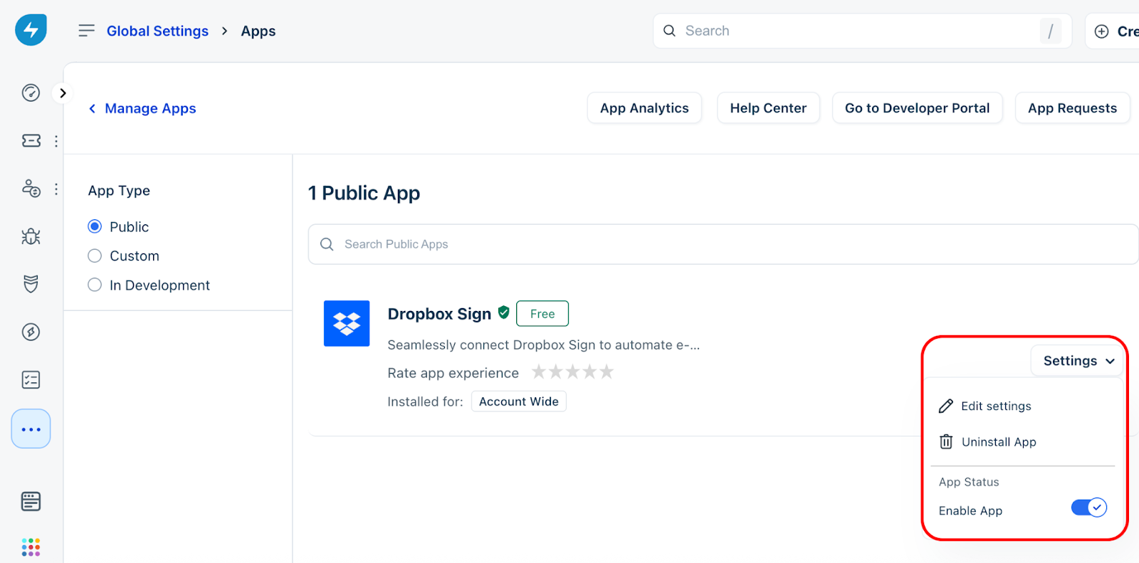 If there are in-progress service requests using Dropbox Sign, Freshservice displays a warning before you proceed.To uninstall the Dropbox Sign app, follow these steps: