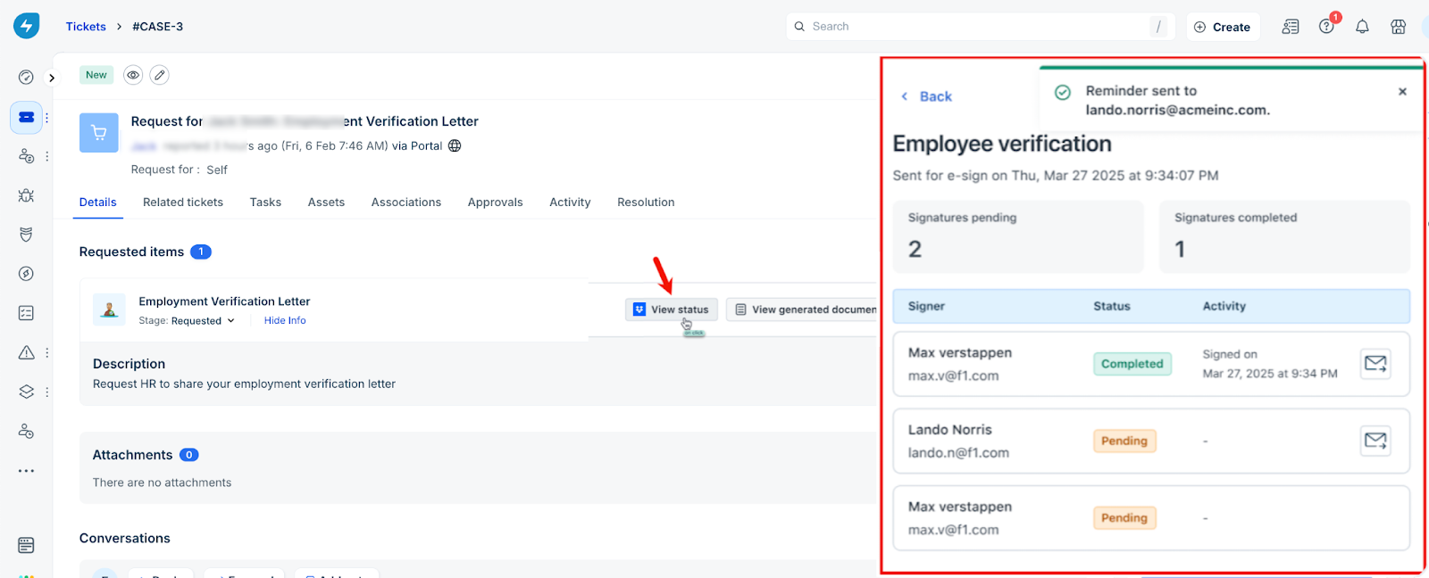 View Status: To track the signature status from the ticket view, click View Status, located next to View generated document. From the audit trail, monitor signature progress, cancel signature requests, and send reminders to pending signers.