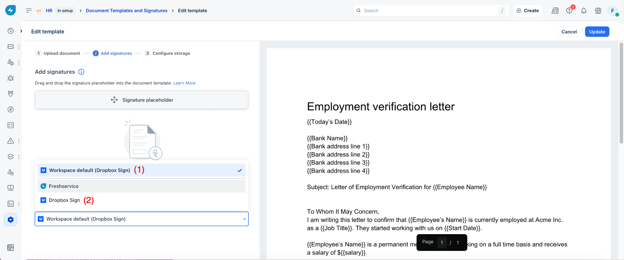 After you select the provider, a confirmation dialog appears. Select Update. After you update the setting, all new document templates in that workspace use Dropbox Sign to capture signatures.