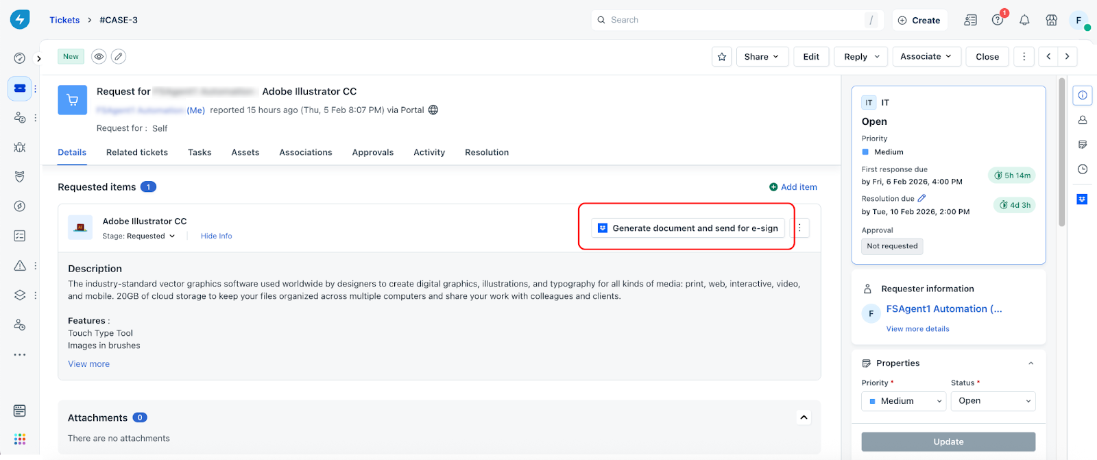 After selecting Dropbox Sign as the e-sign provider, generate the document and send it for e-signature directly from the ticket view, as shown below.