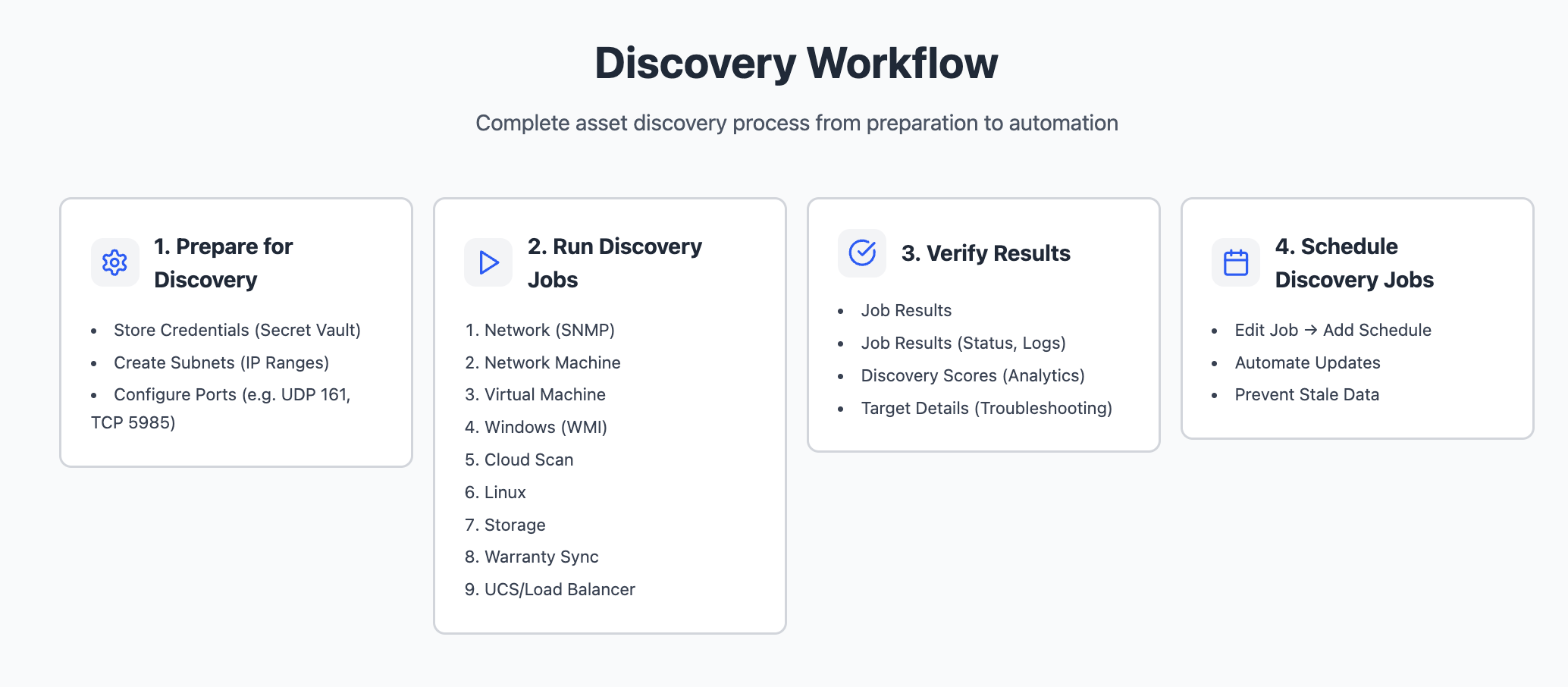 In the Discovery phase, you configure and run discovery jobs to scan your IT environment and collect asset data. These jobs systematically identify infrastructure components, including network devices, servers, desktops, laptops, and cloud resources, and store the discovered information in the central database.