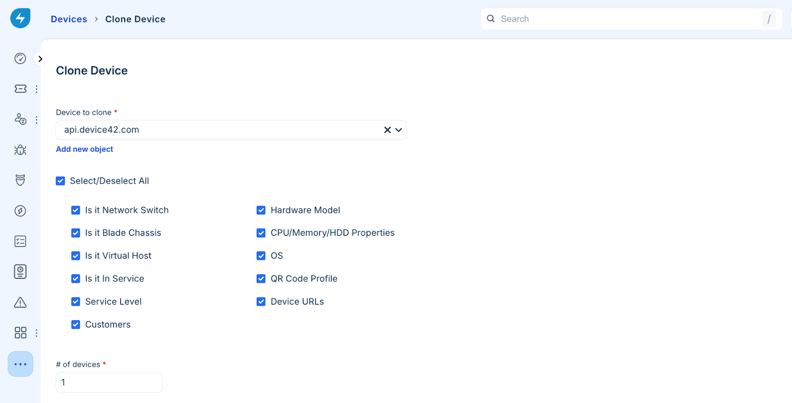 Note: If you select a new service level or customer here, ensure you deselect the corresponding checkbox under Properties to prevent the original device data from being copied.Click Clone.