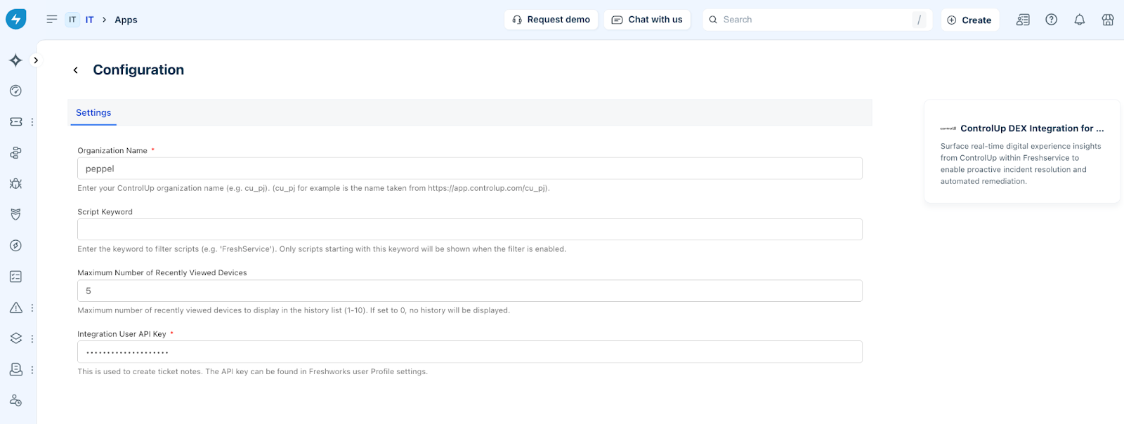 On the Configuration page, enter the ControlUp organization name in the Organization Name field and Freshservice API key in the Integration User API Key field.