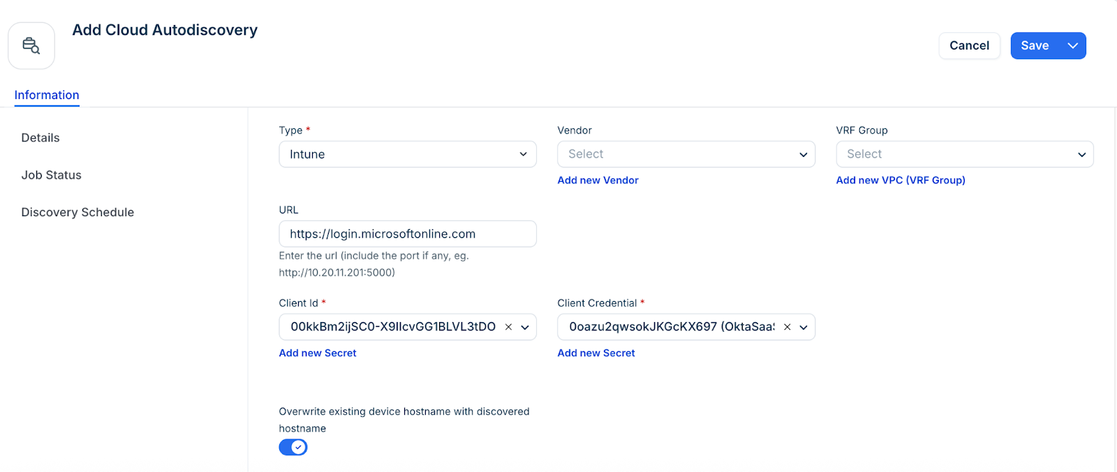 Note: Do not use delegated credentials for Intune autodiscovery jobs.