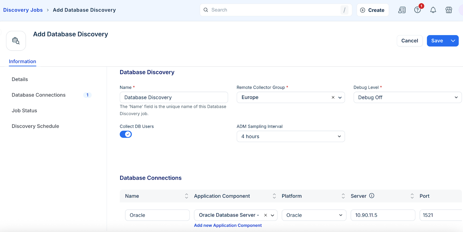 Note: For Oracle discovery, enabling the Collect DB Users toggle allows the system to discover user schemas that do not contain any objects. By default, only users owning objects are discovered.