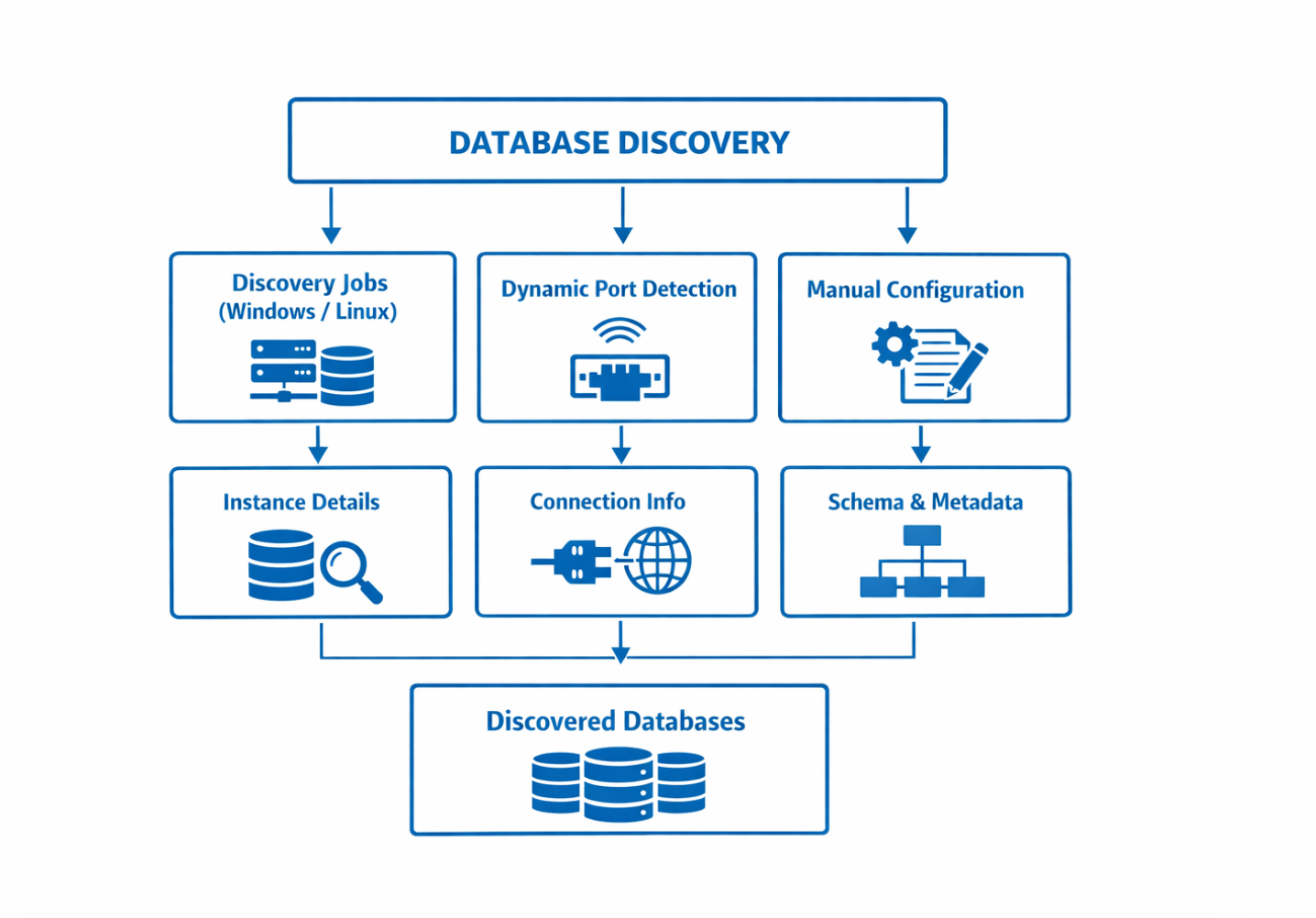 Database discovery detects and catalogs database instances running in your environment, including MSSQL, Oracle, PostgreSQL, and DB2. The process runs through standard Windows and *nix based discovery jobs, returning instance details, connection information, and schema data.