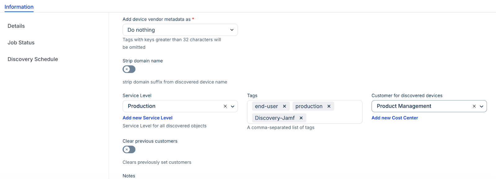 Note: Newly created jobs will not run on the first day of creation to prevent a high volume of simultaneous tasks. To start the discovery immediately, click Run Now on the Discovery Jobs page or from the Job details view page.