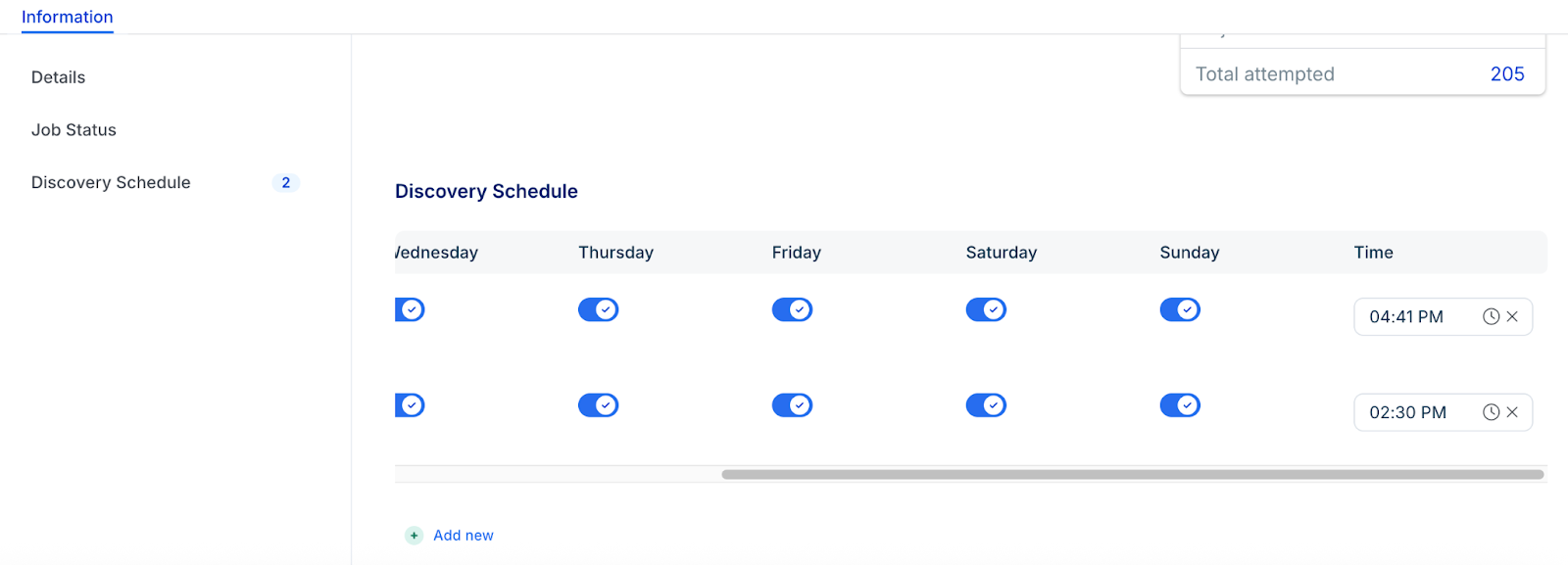 In the Discovery Schedule section, click Add new to create an autodiscovery for the job. You can create multiple schedules.