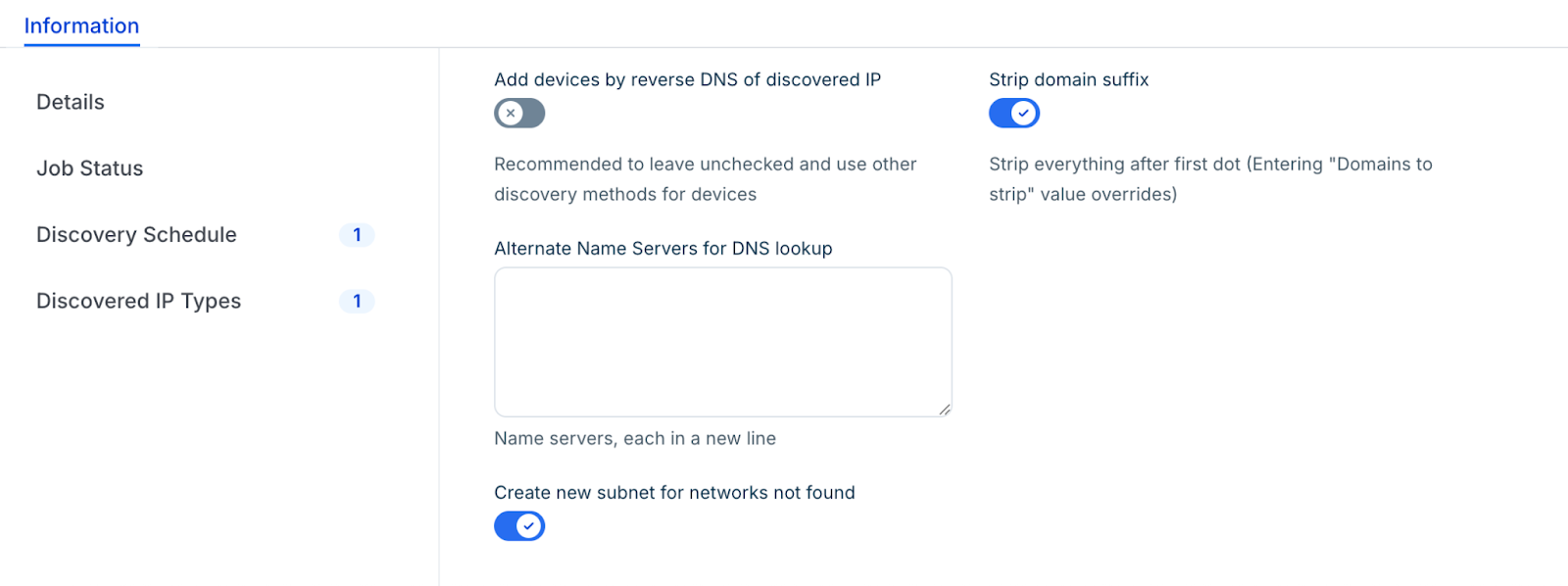 If the reverse DNS option is selected, the discovery process will take longer to complete as the system resolves each live IP.