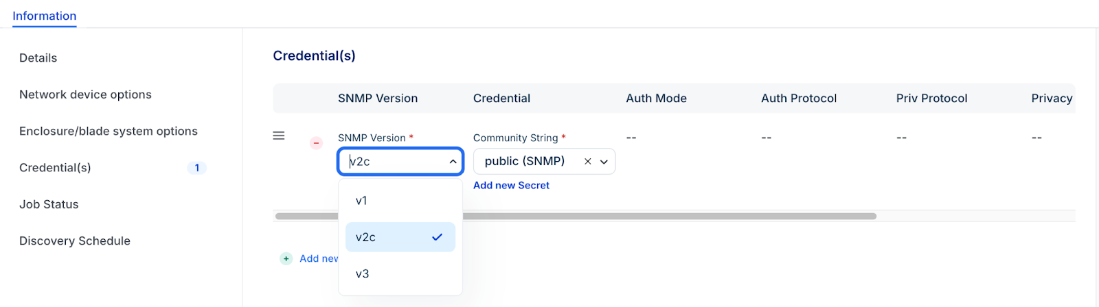 Select one of v1, v2c, or v3 SNMP Version. The job uses credentials in the order entered, stopping at the first successful authentication.Subsequent job runs use the last successful credential and then the remaining credentials in the ordered list.