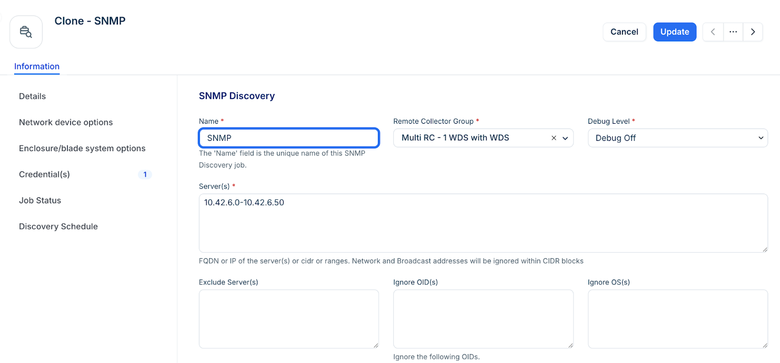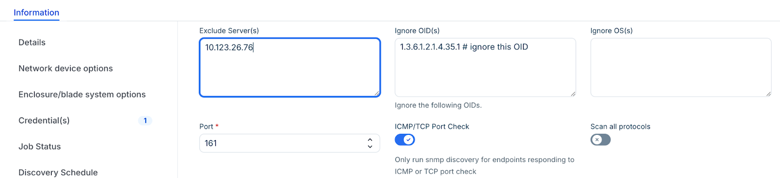 Note: When OIDs are set to be ignored globally, existing discovery jobs do not automatically inherit these ignored OIDs. To apply the ignored OIDs to existing discovery jobs, create a new discovery job.
