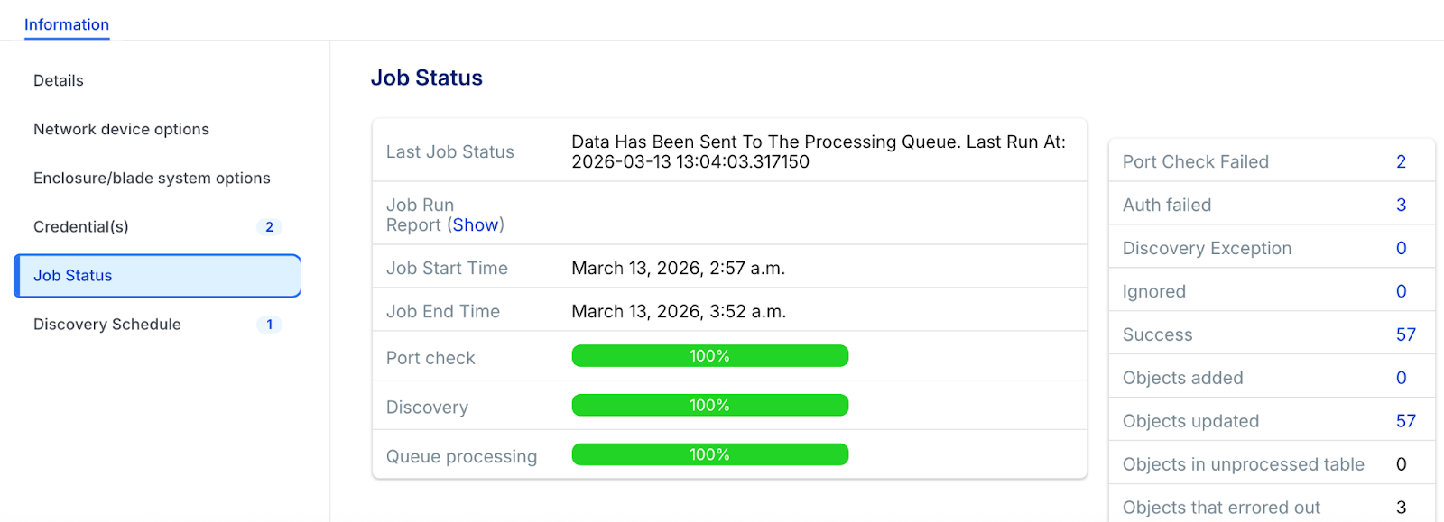 You can view the status and results of a discovery job during or after the job has run in the Job Status section.