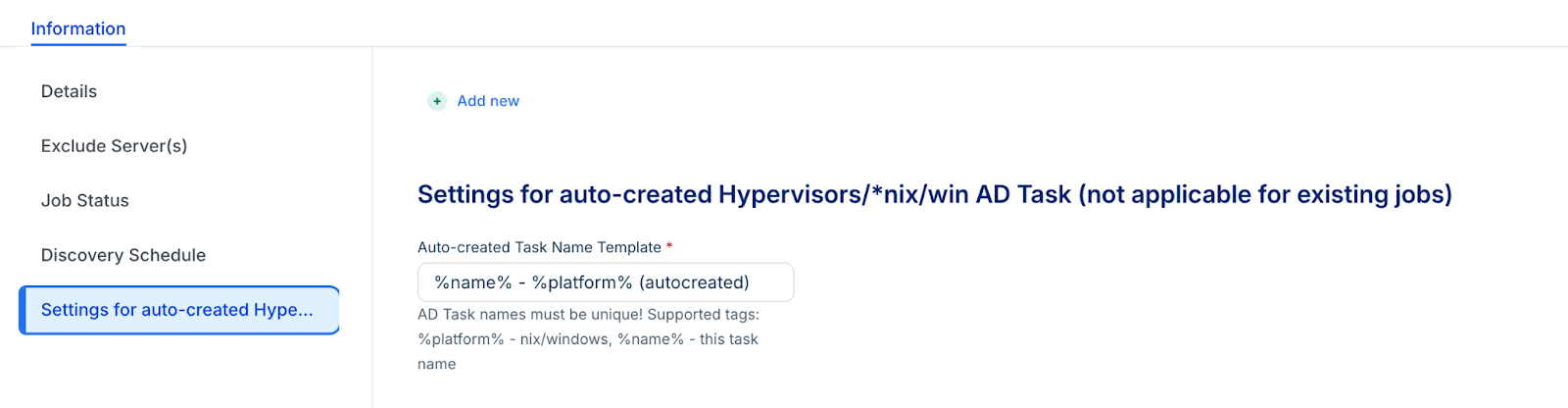 Under Settings for auto-created Hypervisors/nix/win AD, in the Auto-created Task Name Template define the naming template pattern. This pattern is used to generate unique names for the discovery jobs created by the scan results.