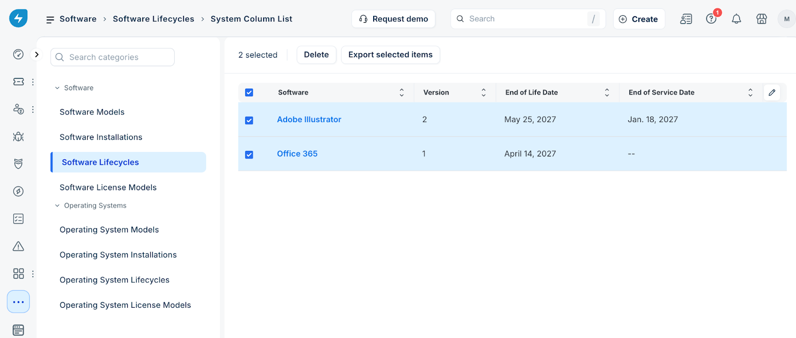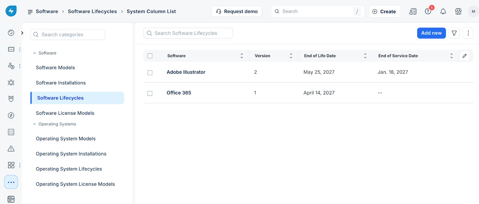 Note: Available only for new signups after the 31 March, 2026 release. If you signed up earlier, refer to the existing ITAM documentation.Tracking the lifecycle of your software components is essential for maintaining a secure and compliant IT infrastructure. You can manage end-of-life (EOL) and end-of-service (EOS) information to proactively plan for upgrades and mitigate risks associated with unsupported software.