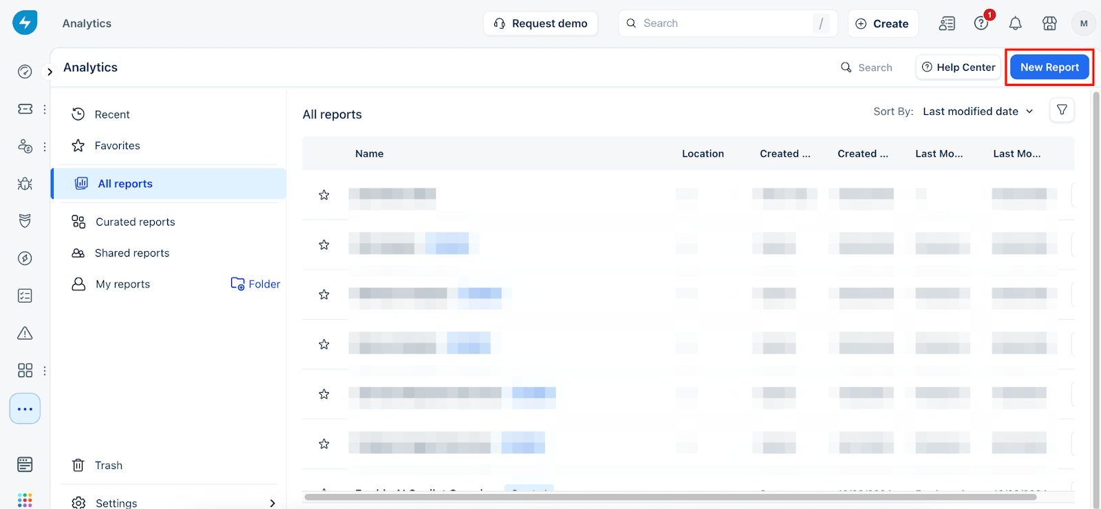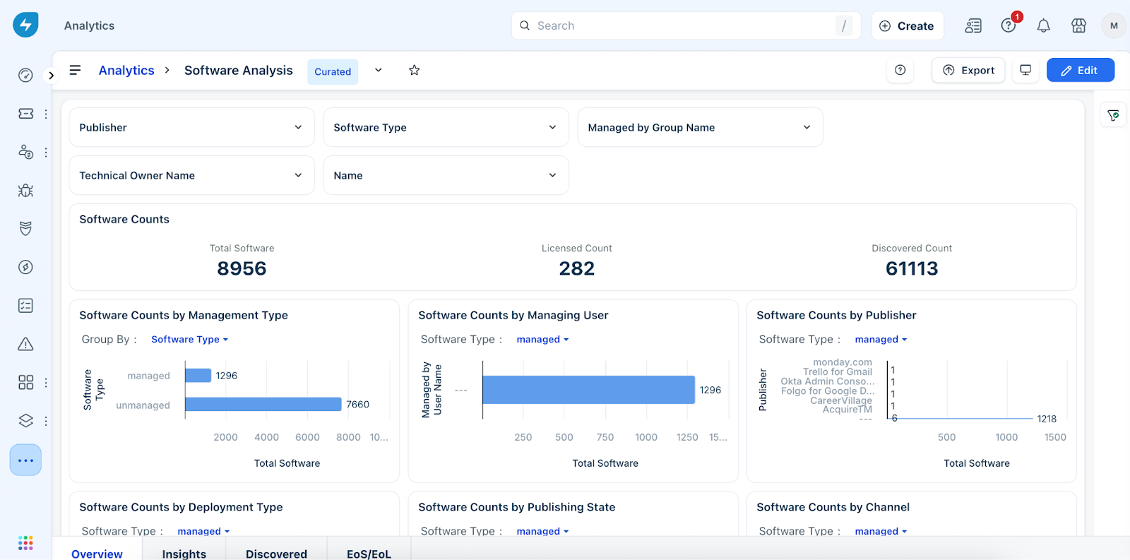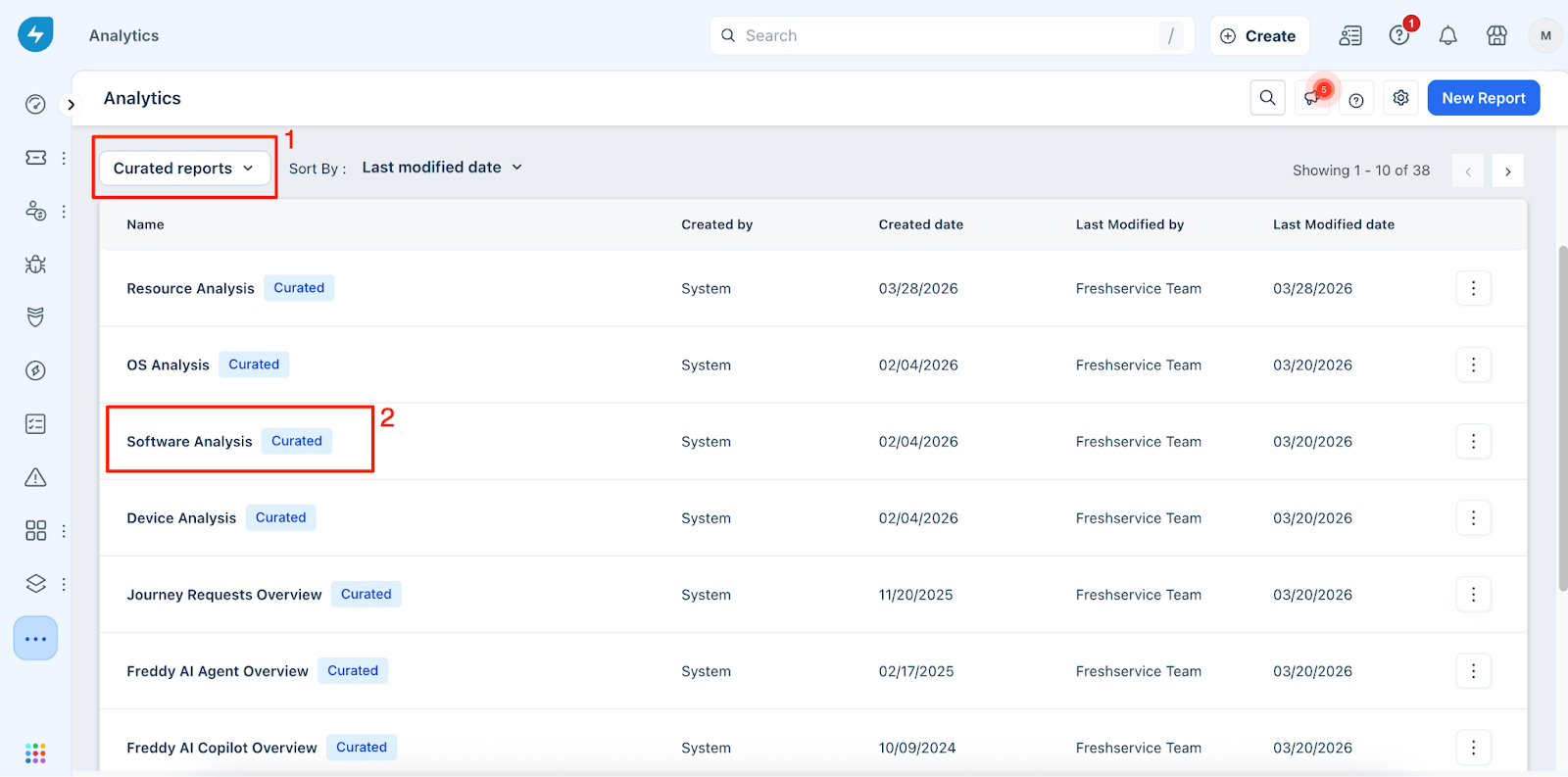 Curated reports in Freshservice Analytics are pre-configured, out-of-the-box dashboards designed to provide instant insights into several modules. To view curated reports for software, follow these steps: