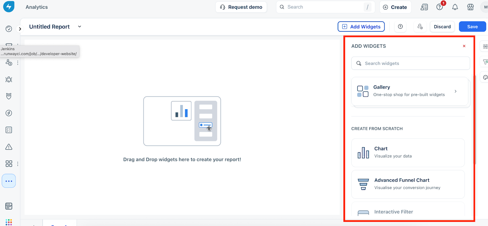 Build a custom widget from scratch: Drag the desired widget type from the Create From Scratch section onto the canvas. Select your specific metrics and click Apply.