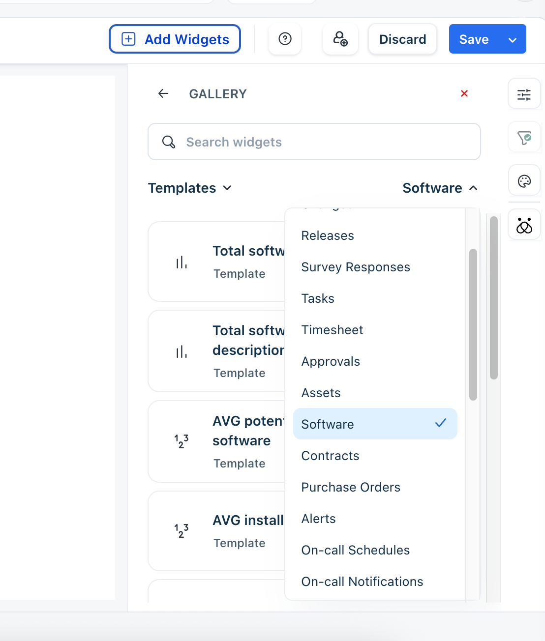 Use pre-built gallery options: Click Gallery and select Software from the dropdown menu to view a list of predefined widgets.