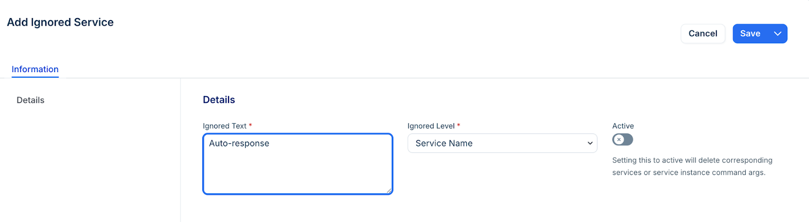 Note: When a service is marked as Active in the ignored list, it will no longer appear in your All Services or Service Instances views following the next discovery cycle. This is a primary method for cleaning up Application Dependency Mapping (ADM) visualizations by removing ubiquitous monitoring tools or system-level listeners that do not contribute to functional application logic.Click Save.