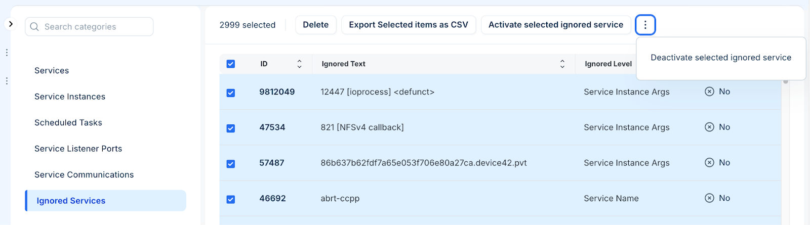 Export Selected items as CSV: Export the list of selected ignored services.