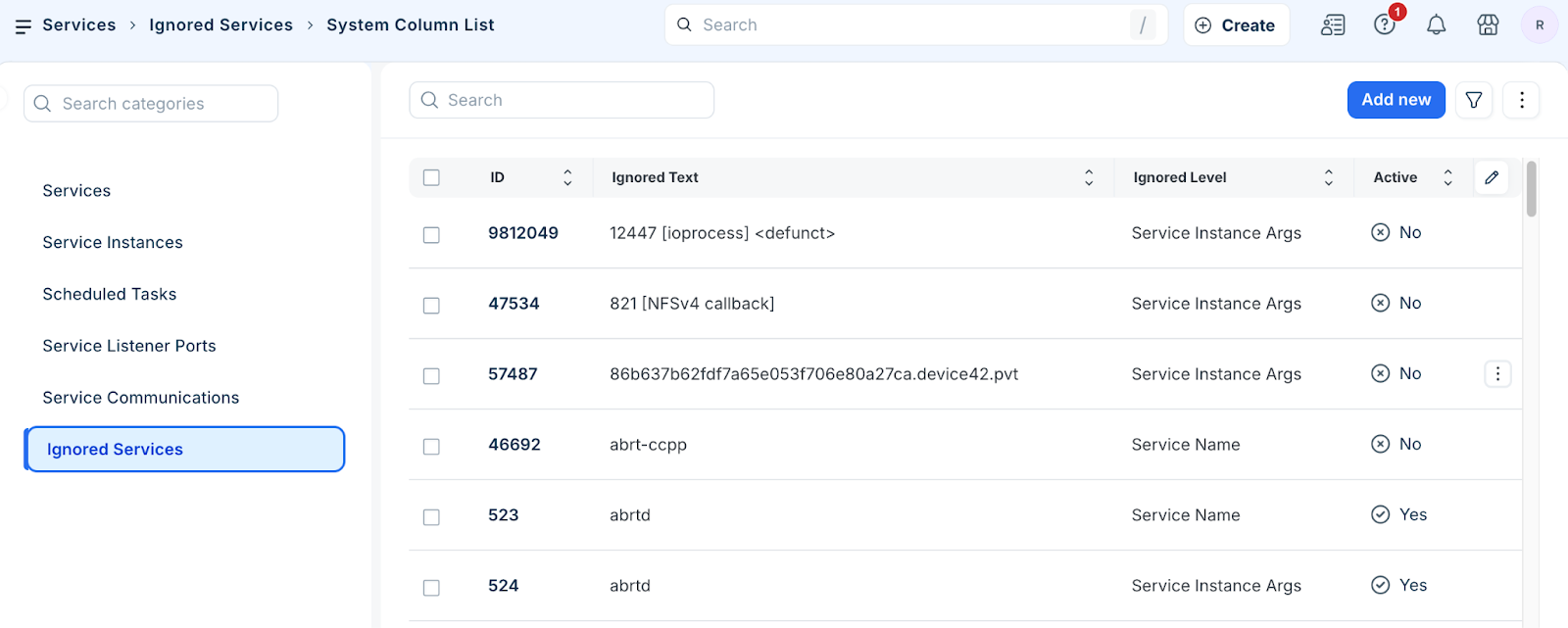 Click on a specific Ignored Service ID to edit the details of an existing entry.