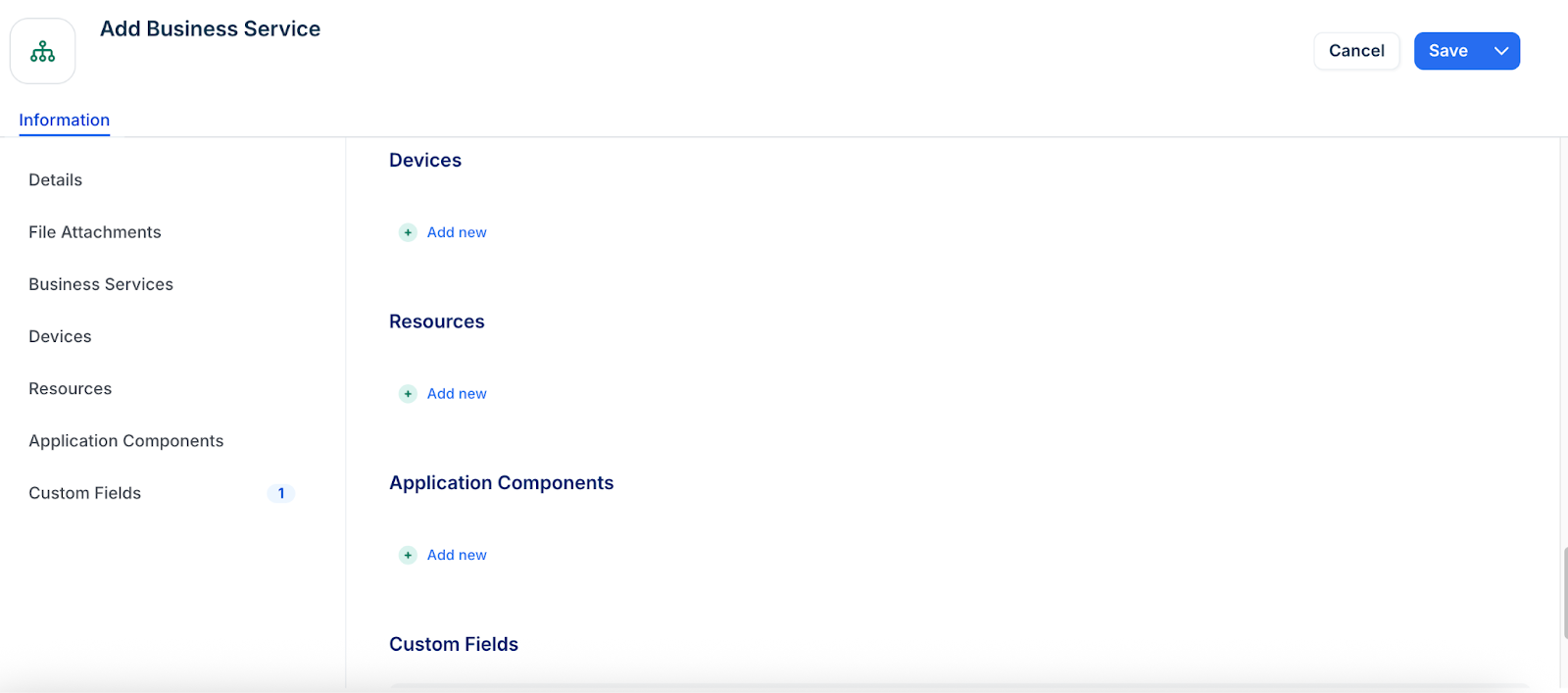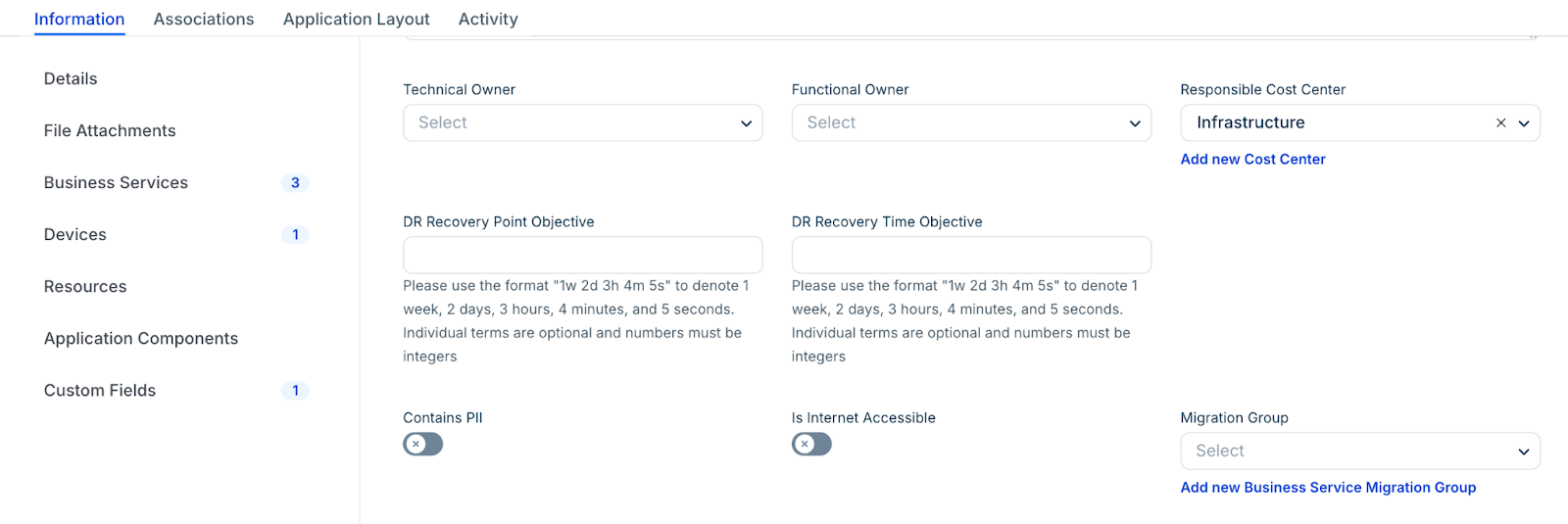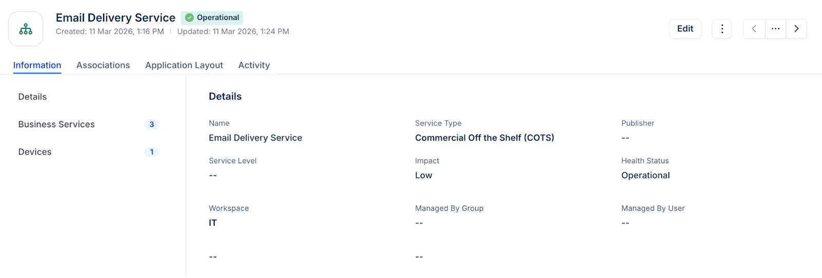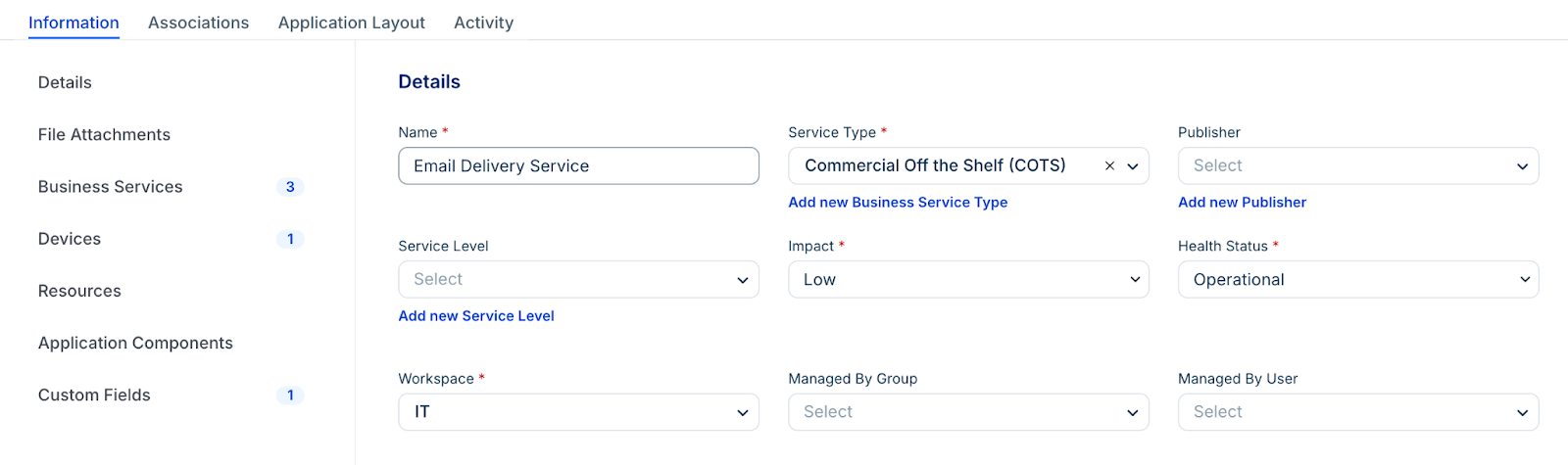 From the details page or the Application Layout canvas, you can associate the following items with your Business Service (in addition to File Attachments and Custom Fields):