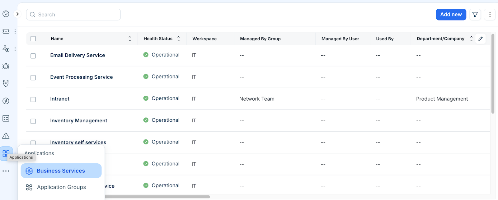 Unlike Application Groups, which are automatically generated from discovered connections and updated dynamically, Business Services are static and designed entirely by you.