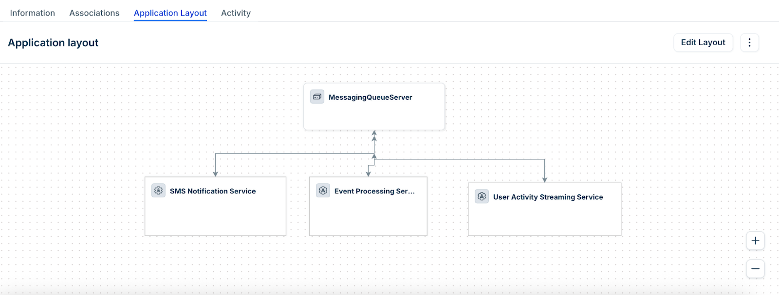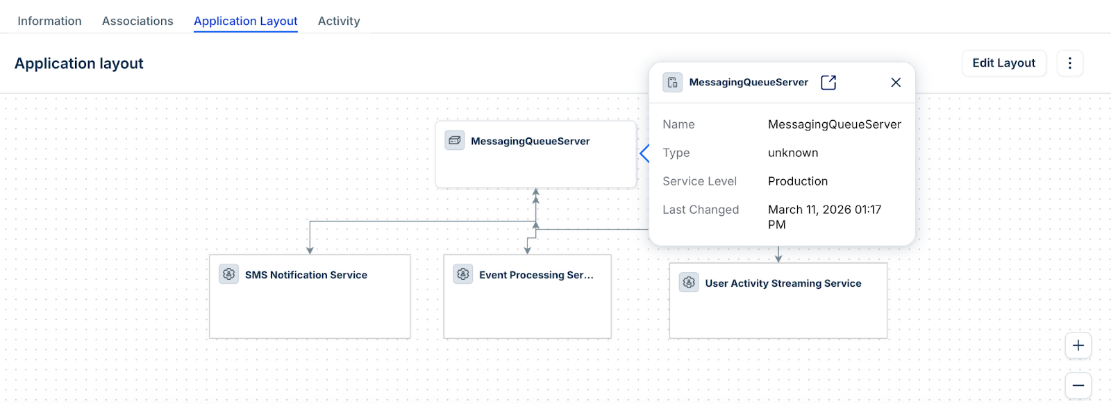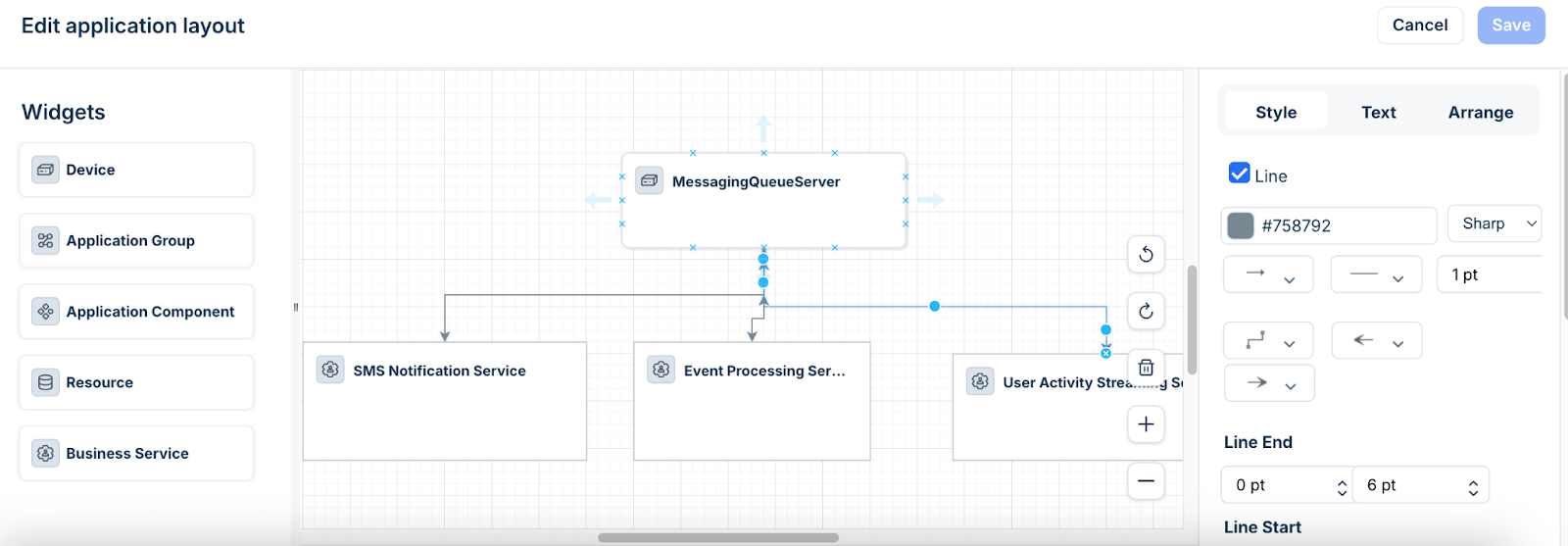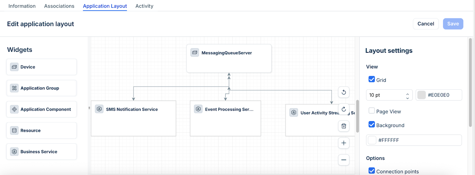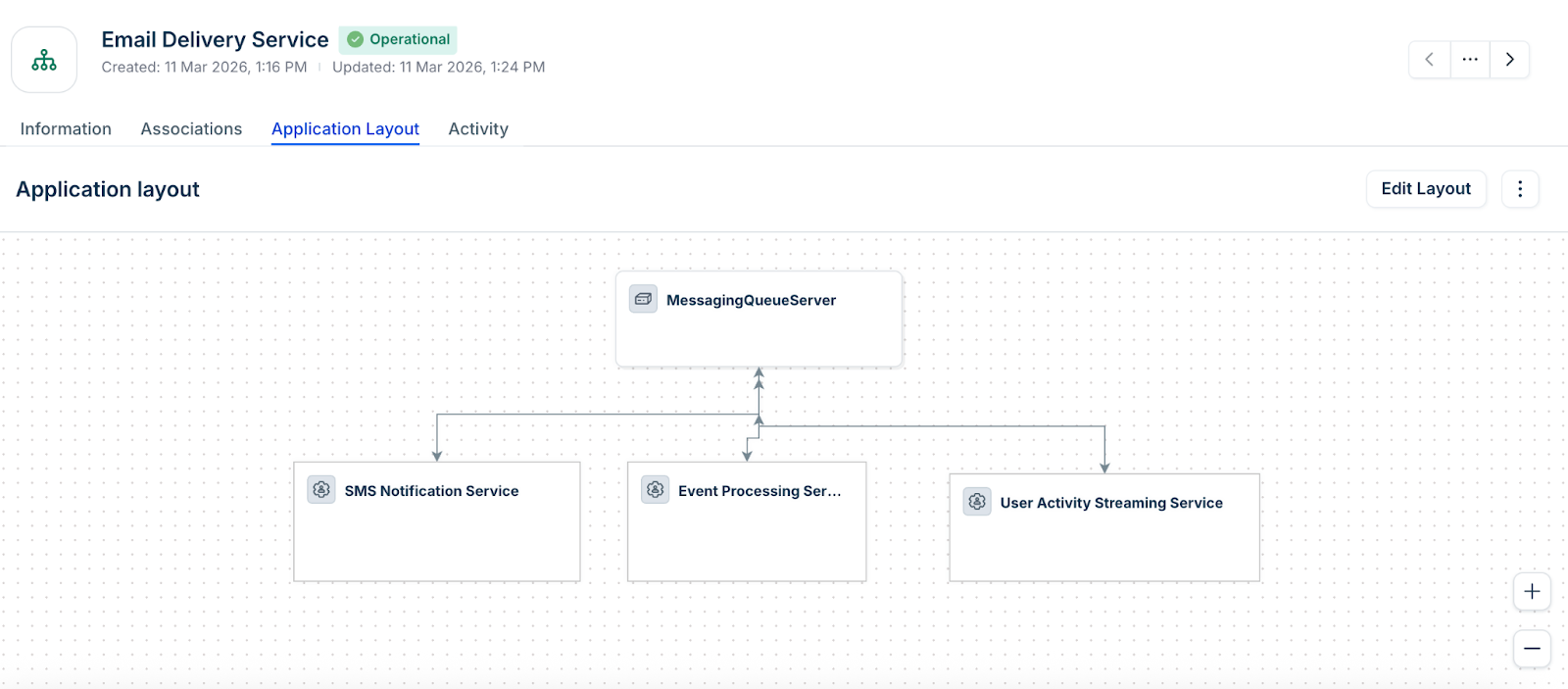 After saving a Business Service, you can open its Application Layout to build and edit dependencies on the visualization canvas. Any items added through the form will already be visible on the canvas.