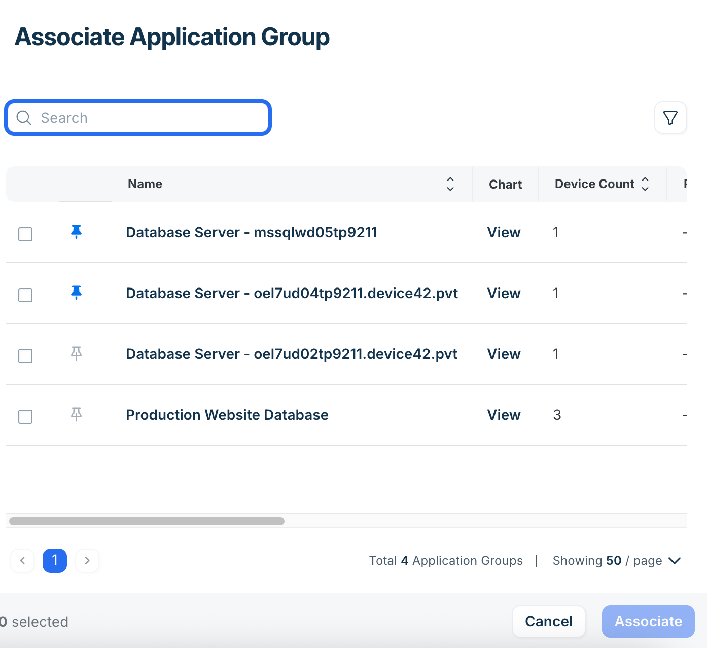Drag an Application Group block to the canvas to open the Associate Application Group window. Search for a group by name and click Associate.