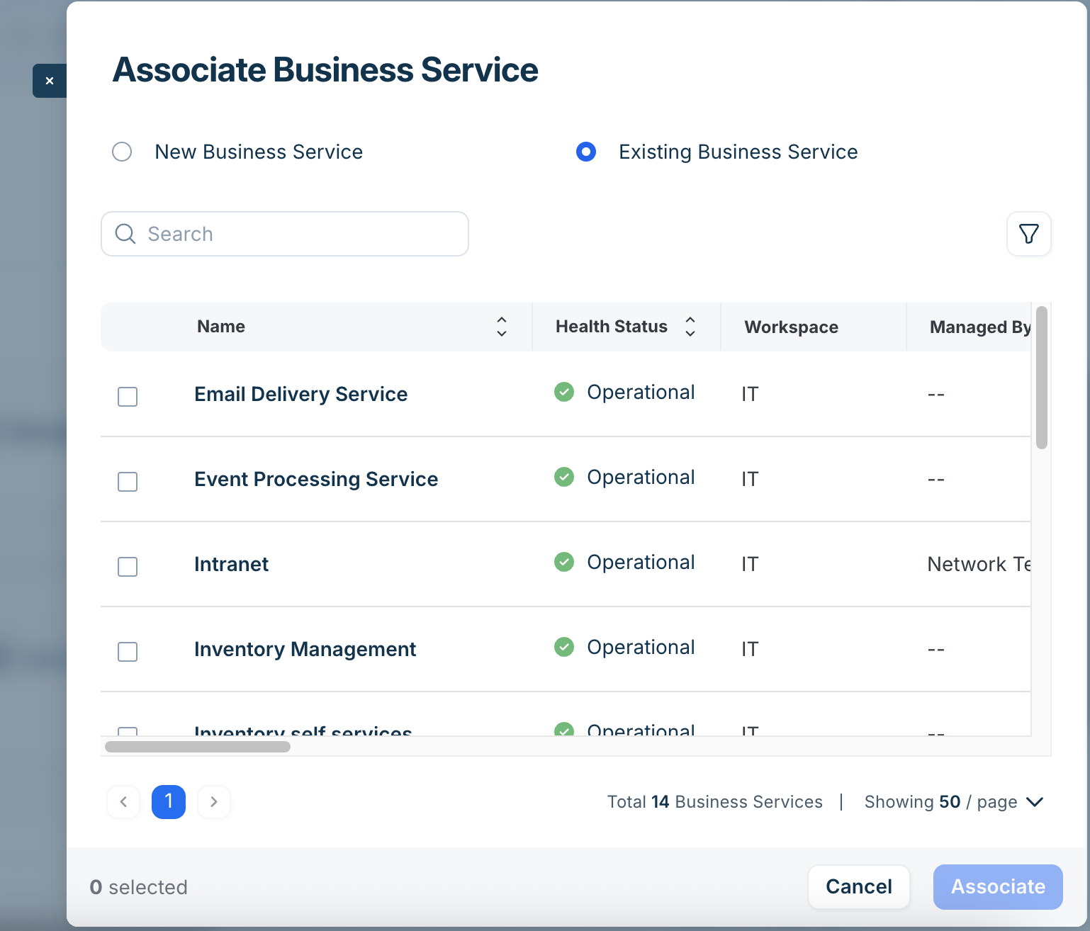 Alternatively, from the Applications > Application Groups list page, select an Application Group and use the Add to Business Service action to link it to an existing Business Service.
