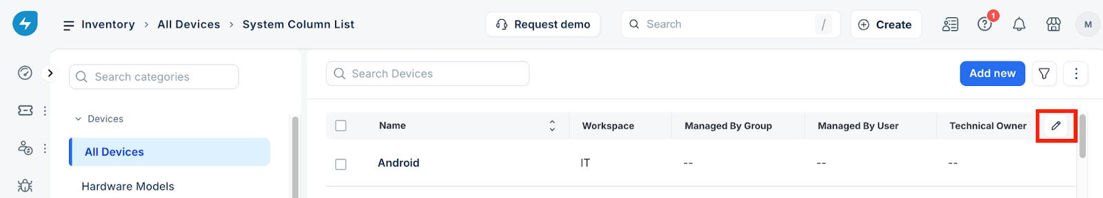 On the device list page, click the Edit (pencil) icon located at the far right of the column headers.