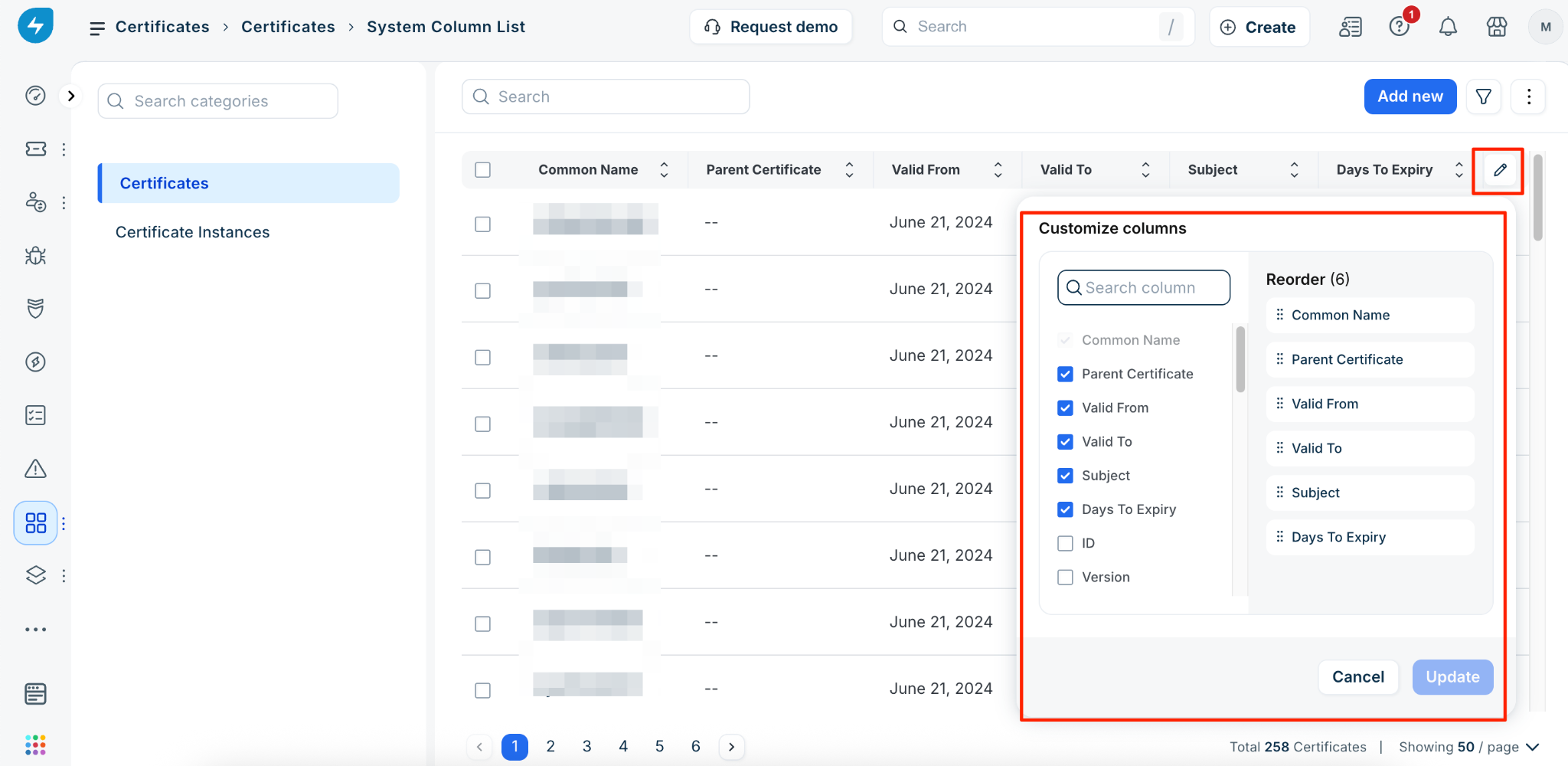 To customize the information displayed in the list view, click the Edit icon beside the column headers. From there, you can select or deselect specific columns, reorder them to your preference, and click Update to save your changes.