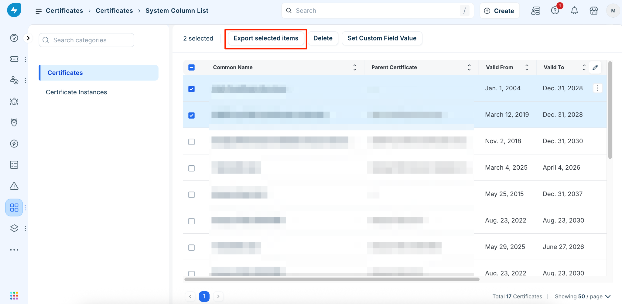 While the Certificates page shows the unique certificate records, the Certificate instances page shows where those certificates are actually deployed. To see where certificates are installed, go to IT asset management > Applications > Certificates > Certificate instances. This view maps the relationships between certificates and specific devices or IP addresses