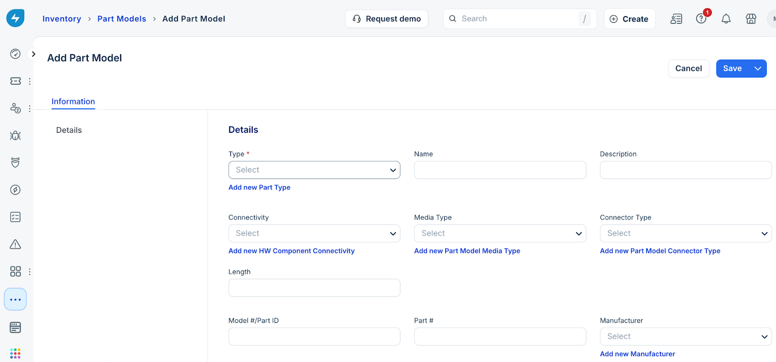 Note: Available only for new signups after the 31 March, 2026 release. If you signed up earlier, refer to the existing ITAM documentation.Part model templates are the blueprints used to define hardware components. These templates specify the characteristics of a part, such as its type, dimensions, and connectivity options. By using templates, you ensure consistency across your inventory, as every physical part created from a template inherits its pre-defined configuration.