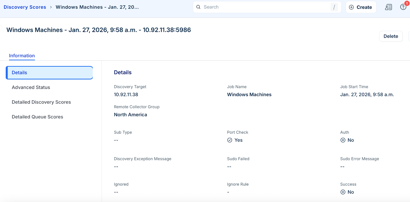Discovery Target Details provide detailed discovery information for a single discovery target within a specific discovery job. A discovery target typically represents an IP address or resource discovered during a scan.