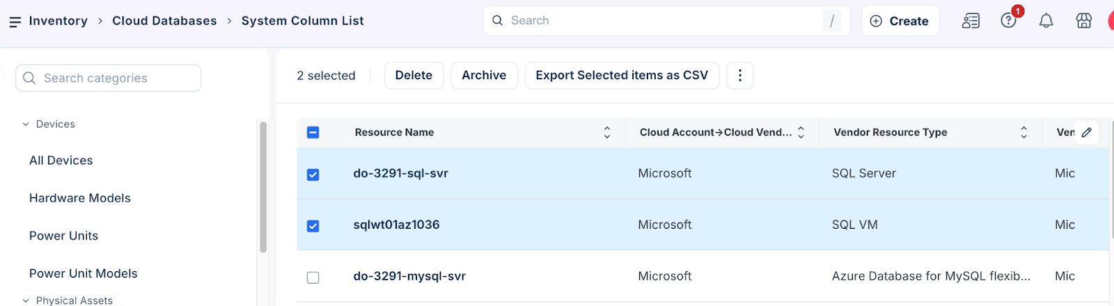 Vendor Resource Subtype: Narrow results by specific database types. For example, RDS, SQL Managed Instance.