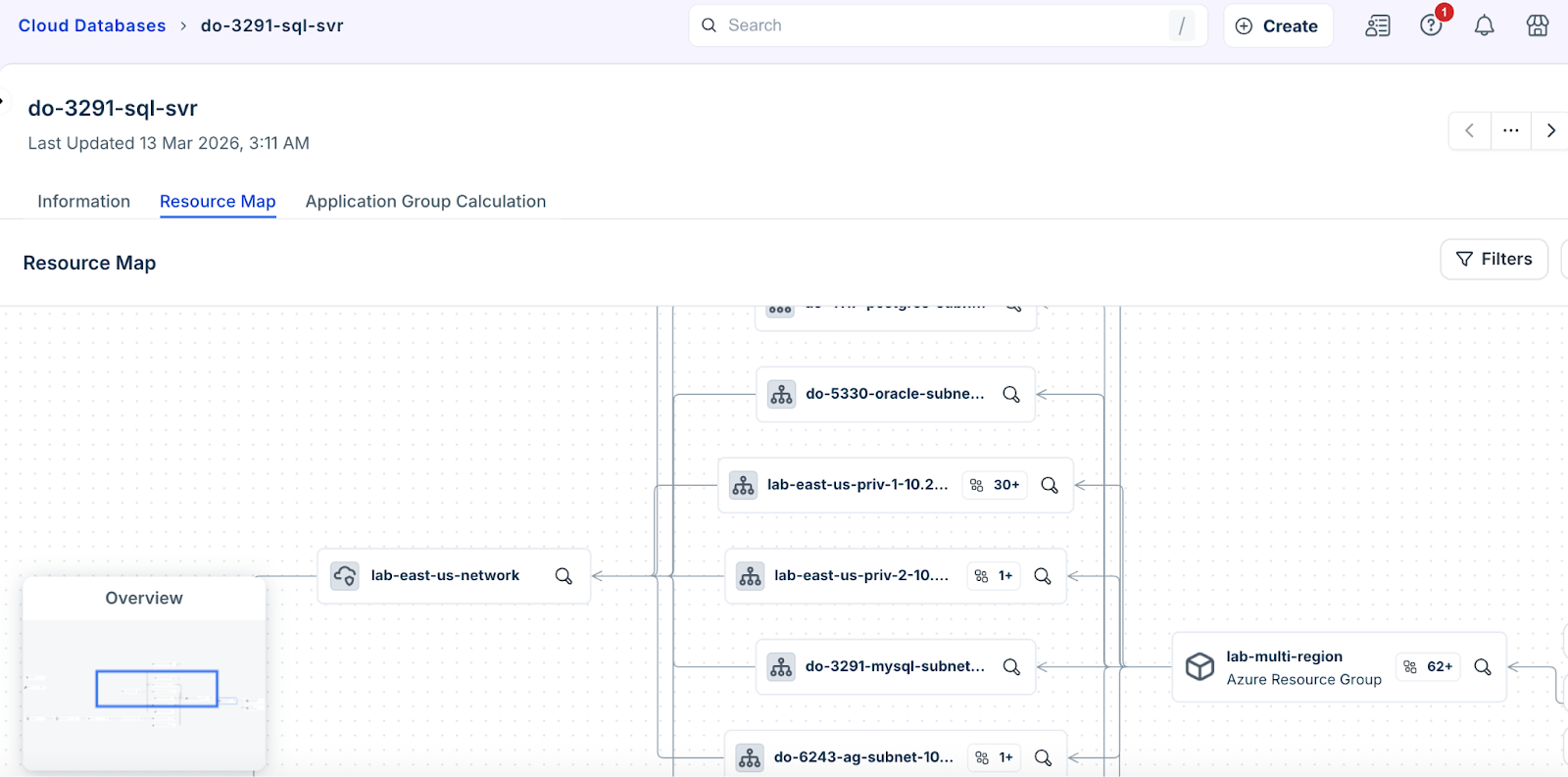 Resource Map: Click Resource Map on the top left of the database details page to view a topology map. You can select specific resource types to include or exclude from the visualization.