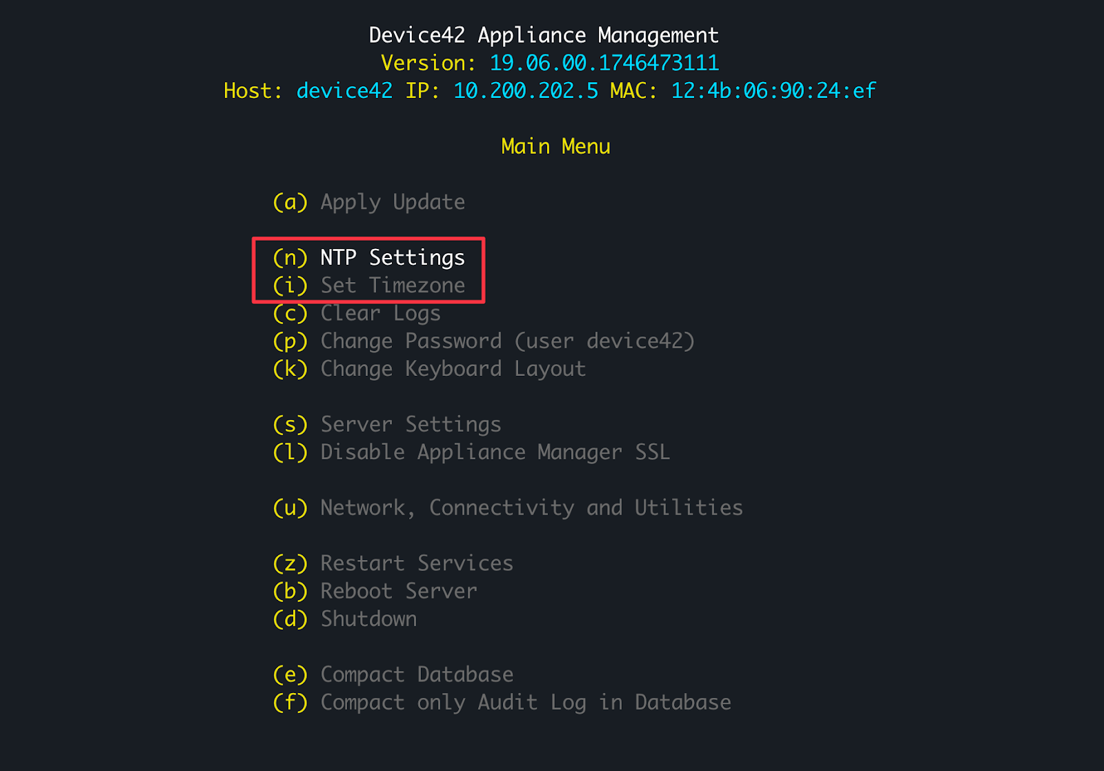 To set the time at the OS level, select (n) NTP Settings from the main menu.