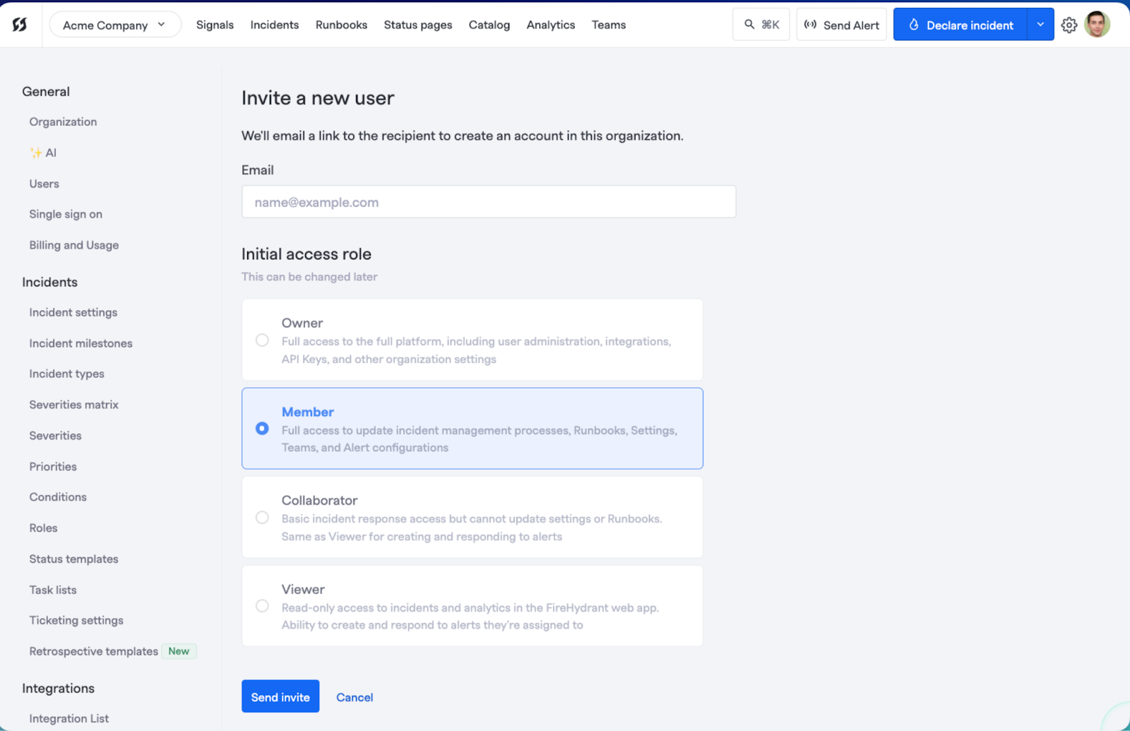 Note: Ensure that your team members are not part of another FireHydrant account belonging to a separate Freshworks org.