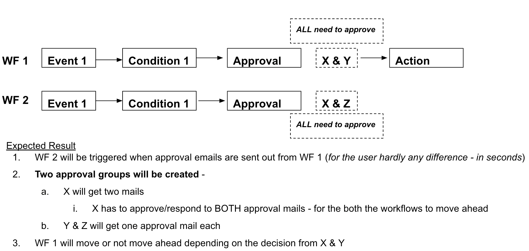 Basically, when the approval decision is received from Group 1 (X & Y), the workflow which is waiting for the same - Workflow 1 - that workflow alone can move ahead.