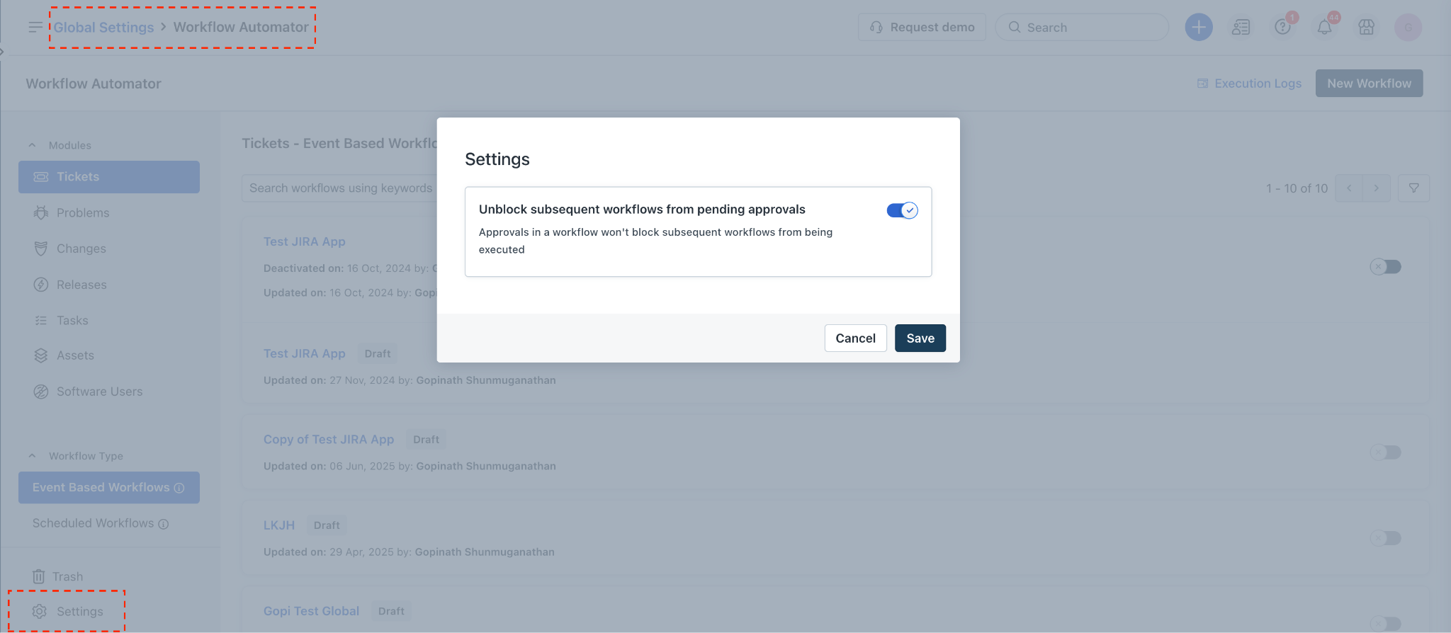 Global Settings > Workflow Automator > Settings