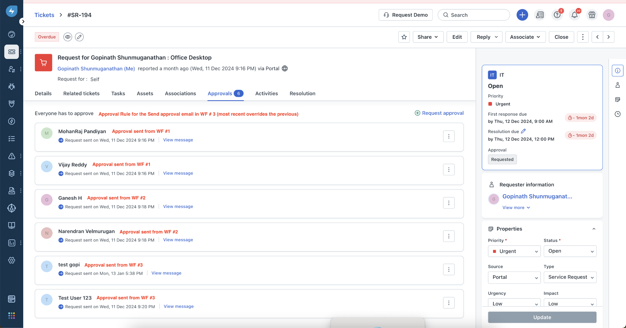 These approvals sent from workflows 2, 3 will all get merged into one single approval group in the ticket/change.